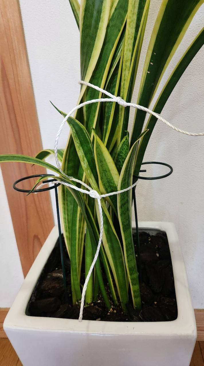 サンセベリアの土を変えて大きく開いていたので支柱とひもで固定しました